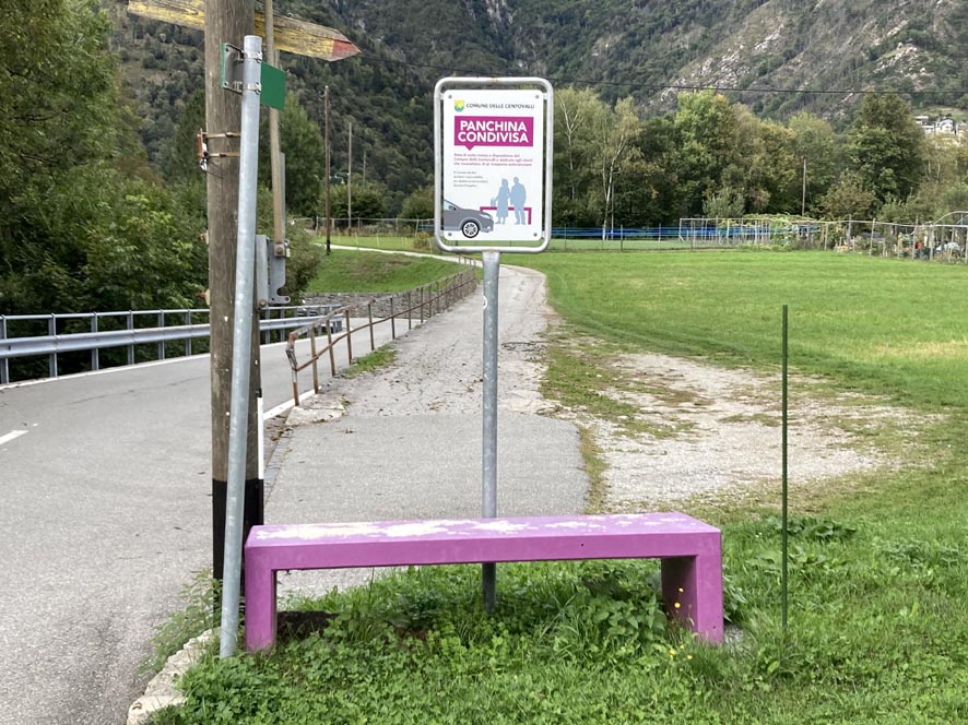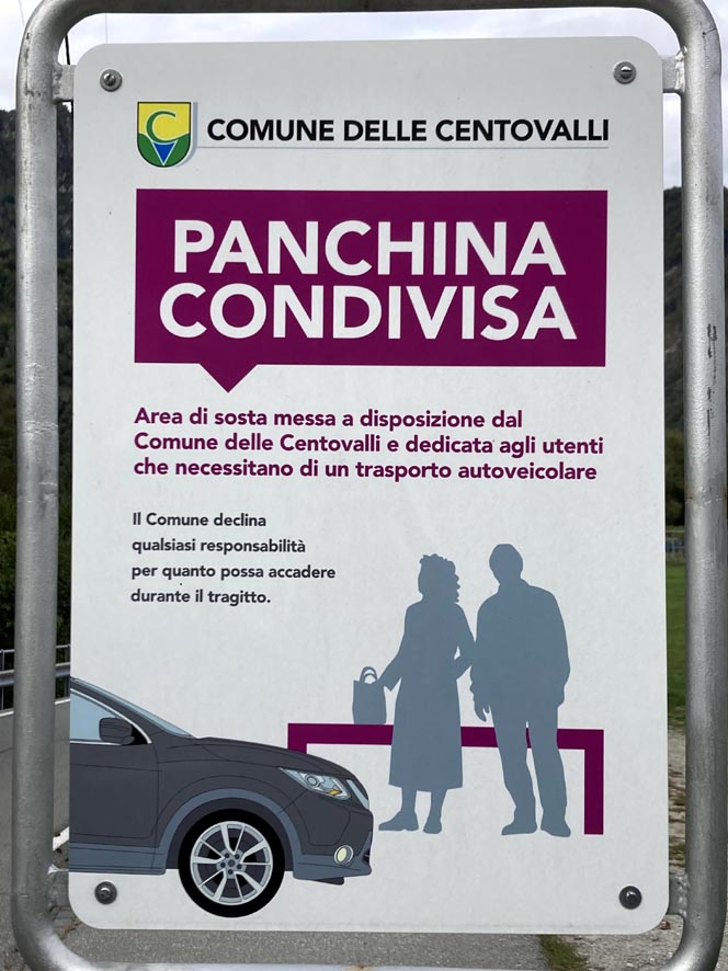 Esiste anche un altro modo per spostarsi dal paese per chi non arriva con un mezzo proprio. Il progetto si chiama «Panchina condivisa», ed è in pratica un’area di sosta messa a disposizione dal Comune delle Centovalli. Essa è dedicata agli utenti che necessitano di un trasporto. La panchina si trova all’imbocco del paese.