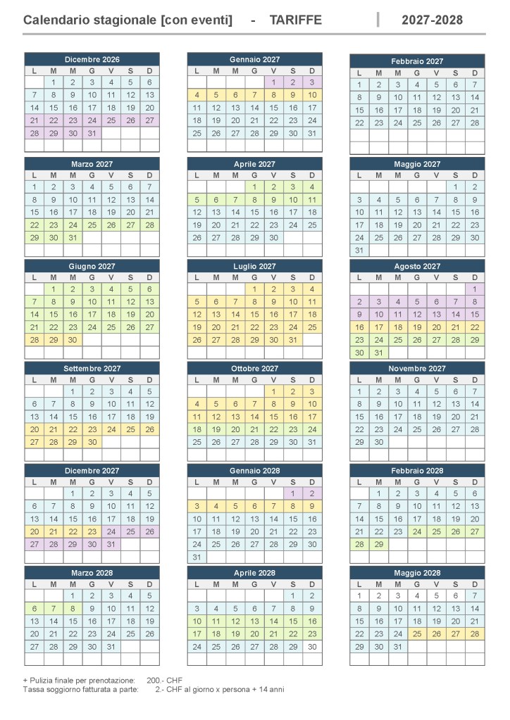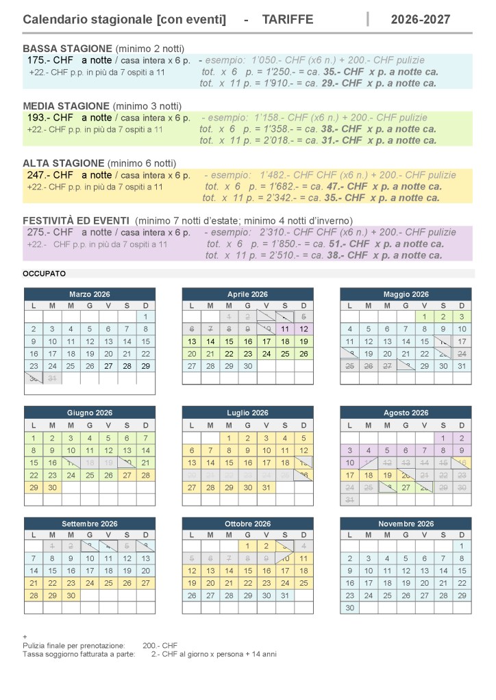 • I 200.- CHF per quella finale è il minimo a copertura dei costi reali (18 h x 4 livelli, 6 locali, cucina, 6/11 letti, biancheria e asciugamani da lavare e asciugare, eccetera), per cui si chiede gentilmente di lasciare pulito il più possibile